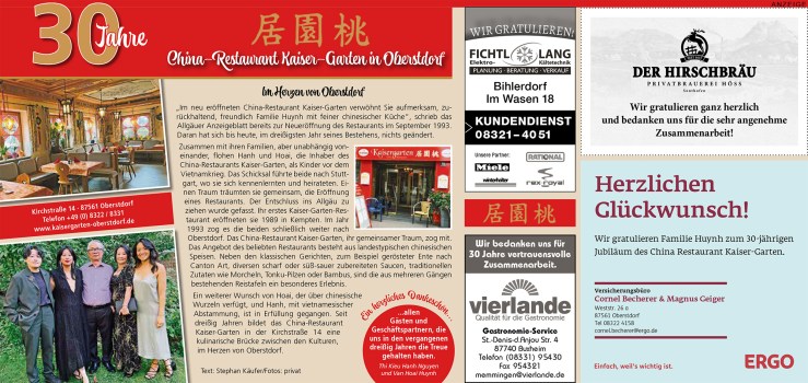 Seit Sommer 1993 gibt es nun das familienbetriebene China Restaurant Kaiser-Garten in der Kirchstraße 14 – das erste China Restaurant im Herzen von Oberstdorf im Allgäu.
